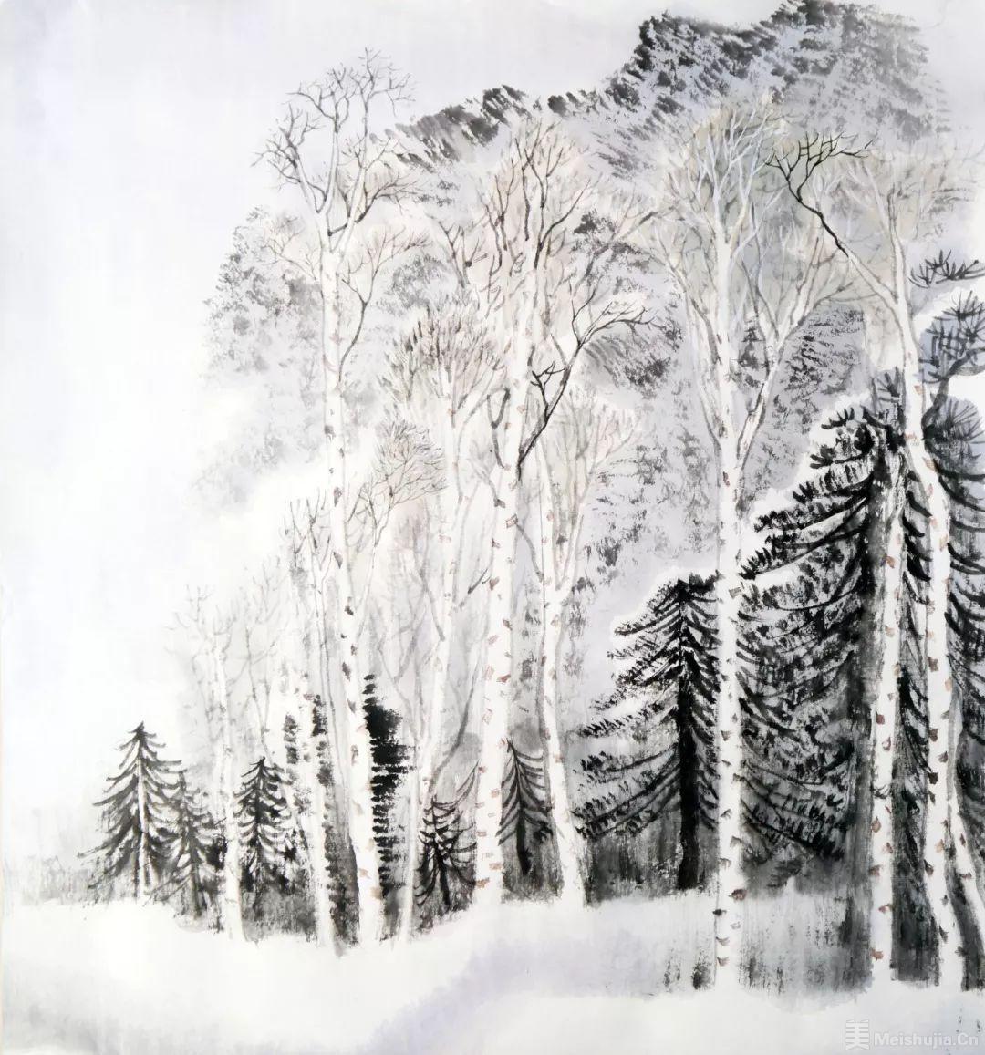 芭蕉情结从十几年前在江城读研时就开始了,学校里一片芭蕉林,长得茂盛,让我这个从江北来的侉子惊叹不已,尤其到了雪天,芭蕉朽而不死,积雪覆身,很是动人,很入画。于是当时画了《春寒料峭》表现雪蕉,画了四条屏《蕉叶翻飞四季诗》来表达对生命轮回的思考,近年又作《雪蕉竹影》系列,在画面的形式语言处理上做了一些探索。一方面想从熟悉的题材积累创作风格,另 一方面也想借助雪蕉营造一个象外之境,一如王维的雪里芭 蕉一直是画苑奇构。