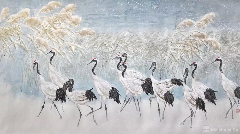 杨德衡1939年生于辽宁,1964年从鲁迅美术学院中国画系毕业,之后从事专业美术创作,曾经担任辽宁画院副院长。他继承了京津画派的精髓,擅长工笔重彩、没骨法、小写意,尤其喜欢描绘仙鹤。