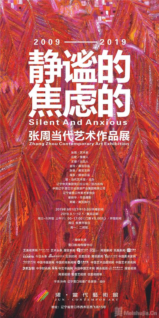 本次题为《2009—2019静谧的 焦虑的 张周当代艺术展》,是艺术家精选出的50幅作品。试图将原本的艺术观、价值观、人生观向当代的艺术观、价值观、人生观转变的心路历程展示给我们。十年来面对当代艺术张周是静谧的,也是焦虑的。静谧是指如何弃掉诱惑,安安静静地面对当代艺术。焦虑是指怎样弃掉过去的熟知,实践未知的当代。就此,艺术家反复地在具象现实主义与抽象表现主义之间游离;在中国式的情绪书写与西方波普机械式之间漂浮;在蒙德里安冷抽象硬边主义绘画与波洛克的抽象表现主义绘画之间徘徊;在使用传统的画材与废旧现成品之间犹豫……“现实性焦虑”了。也正因为艺术家的焦虑(游离、浮躁、徘徊、犹豫)使其在心念思维中思考,从自己的认知格式中诞生了新的艺术感受和新的观念——当代艺术。