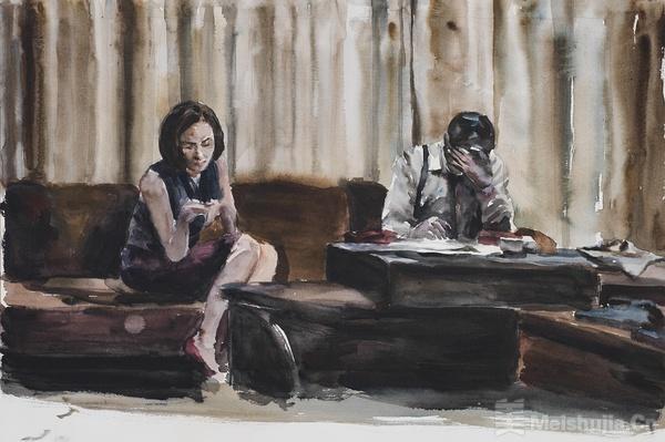 他的画面给人以心理悬疑,被微妙变形过后的人物形象、表情等,被紧张的猜疑填充起来。他们有着种种不安,内心可能正在酝酿着采取行动的动机,或已经激烈波动,但仍然自我控制着,没到激烈行动的那一刻。大多数人的心机沉沉,让个体之间的关系很复杂,即使两个人独处时有亲密行为,在冰冷阴森的氛围里,也只是很有限的信任感。混乱的时空里,人群被阴谋感笼罩,反衬出生存环境的凶暴底色。