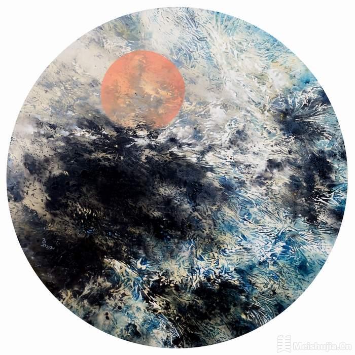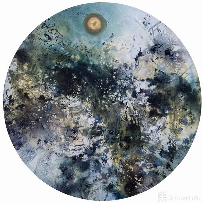此次展览以新的表现风格诠释对山水及山水画的另一种思考,无相山水系列融合了东方思维中的阴阳观,并带入水墨画的韵味及空间表现,故在用色上以黑色为主,结合浮油彩技法表现出色彩交叠的层次韵味,外观上作品多以圆幅和椭圆形式呈现,为求契合东方精神中的圆融之意,与气的宇宙循环观念;作品-融是系列的开端,表现宇宙浑沌之境,聚合一作阐述气的生成后,天地万物开展、定位,而共生之作则是表现万物聚合后的相生与互补概念。