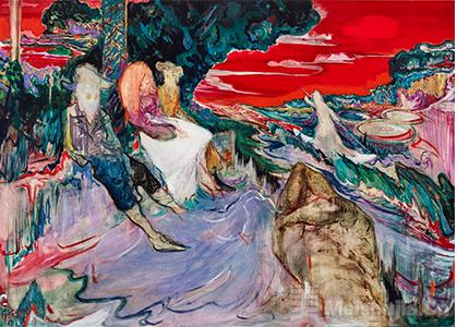 相对于上述三位艺术家充满抽象性的追求,傅饶和苏旺伸的展出作品则充满社会与人性的关注。傅饶的画作《云火》(Cloud Fire),画出前往希腊天堂之岛路上的一幕,有神情疲惫休息中的赶路人,和远方火焰般天空的风景下所透出的不安美感;而类似的不安在苏旺伸的作品《田之犬》(Dogs in the Field)中则转化成诙谐与嘲讽,他笔下有如特技表演的犬隻始终回应台湾社会长期为政治和意识形态绑架的尴尬。米库和邬一名两件以植物为主题的参展画作,亦分别以炭笔和水墨为蔬果的生长和样貌构筑了一番全新的风景意象,引领我们步入一个充满生气与活力的有机世界。