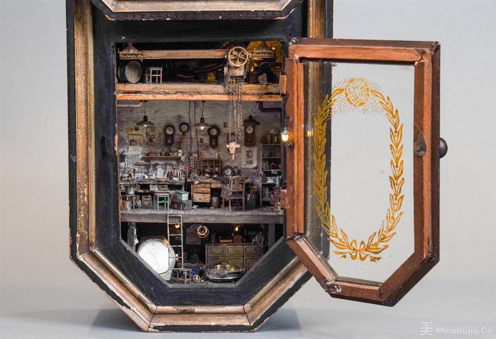 展览将首次展出郑鸿展的最新作品《流光似水》,该作由朋友赠送的昭和初期八角挂钟改造,展现了钟表师修理钟表的工作场景,墙上的挂钟指针、使用过的散乱零件、生锈的工具都清晰可见。