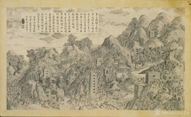 整件作品从绘稿到印刷历时13年,全套共包含16幅铜版画,配以乾隆帝亲笔序文、题诗和臣工跋文的木板刻印,共计36幅。战图采用全景式构图,场面辽阔,刻画细致入微,体现了当时铜版画制作的最高水平。