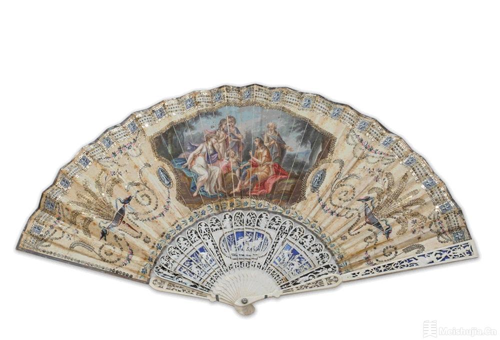 (5/7)象牙骨纸本单面绘开光外国人物图折扇,清代