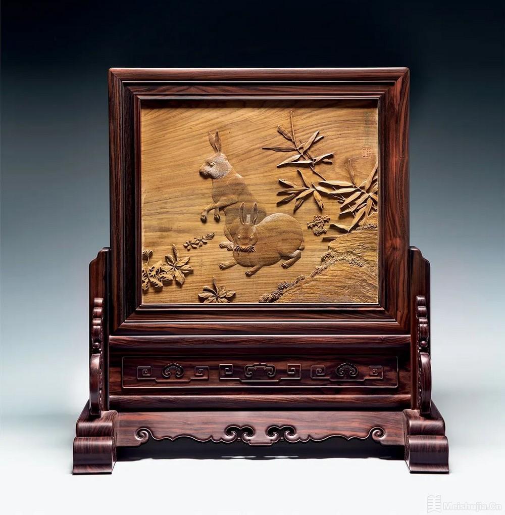 (2/6)桌屏《双兔图》,材质:大叶紫檀