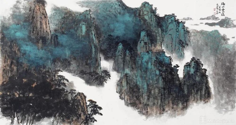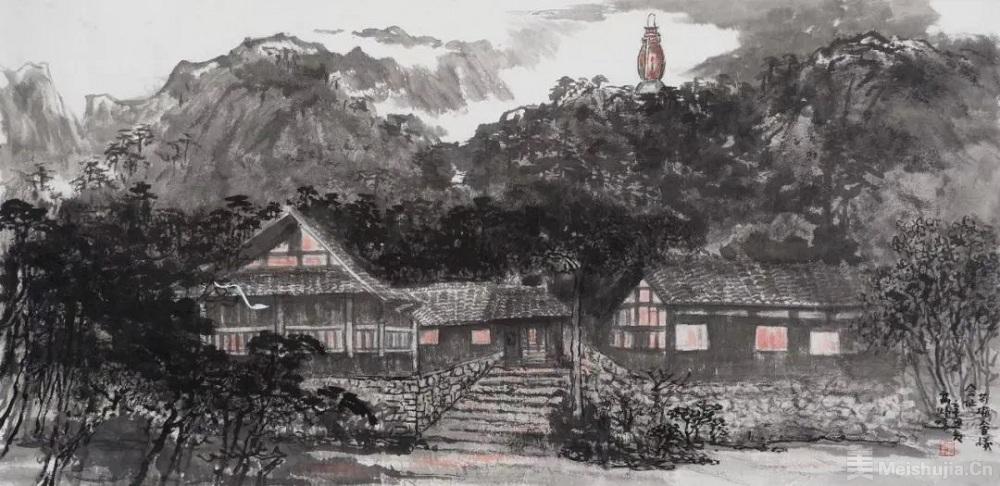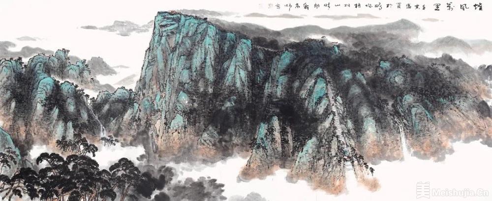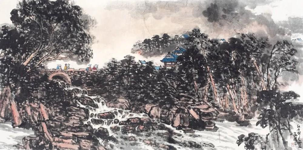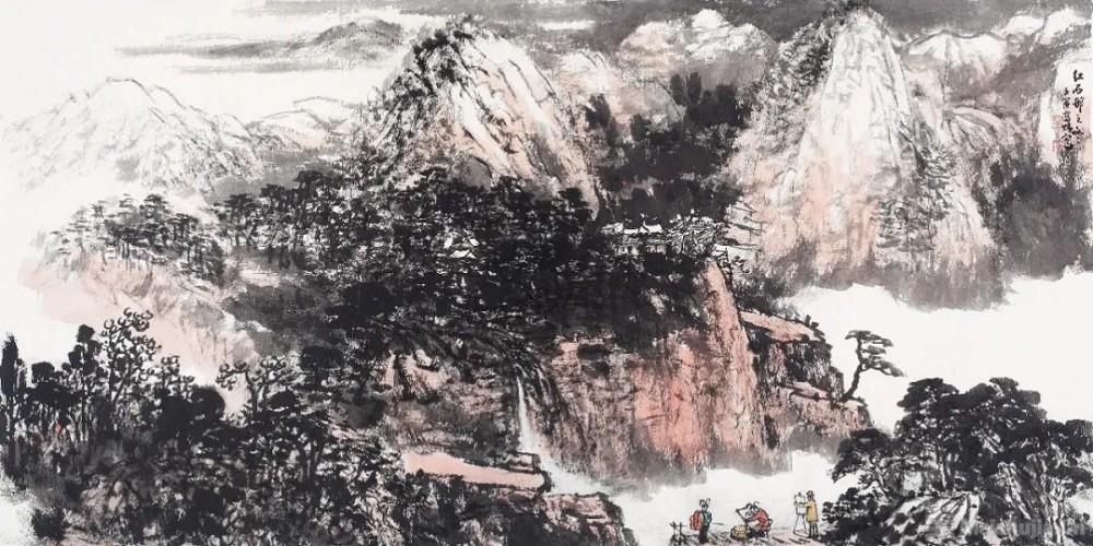 本次展出的山水画分为三个部分,「山水见证」展出《苟霸会议会址》、《突破乌江》等描绘革命遗迹的作品,在这类主题性创作中,红色叙事主题景物突出,彰显出高炜庄重、崇高的艺术取向。
