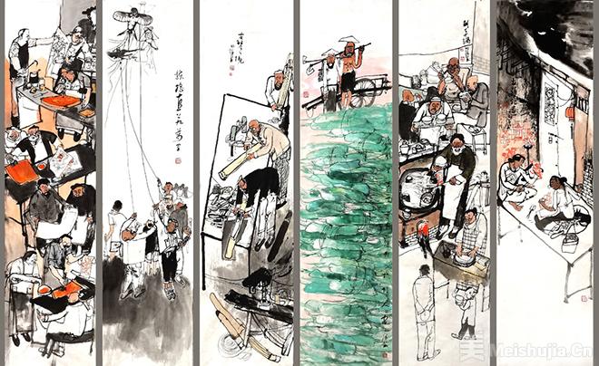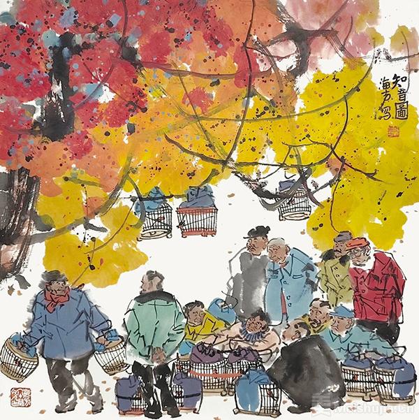 马海方的没骨法重彩写意人物画以北京风俗民情为题材,可谓独树一帜。先生笔下的京城百态,恍若传统年画里的朱砂,穿越时空,在宣纸上晕染出生命图腾。胡同里的吆喝声凝成枯笔焦墨,茶馆中升腾的热气化作水墨氤氲。他以考古者般的严谨与诗人的浪漫,将人间烟火定格为永恒的人文标本。那些游走在没骨重彩与写意皴擦间的市井人物,恰似潍坊龙头蜈蚣上的九霄鳞甲,在传统与现代间倏忽西东,刹那峥嵘。