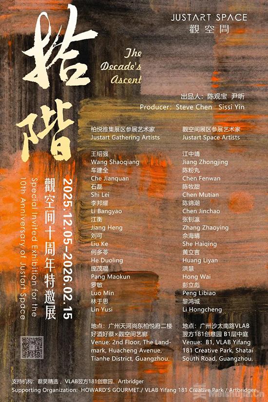 光阴十载,气象更新。觀空间荣幸地宣布,将于2025年12月05日起呈现画廊成立十周年特别邀请展——“拾阶”。本次展览将在两个展区分别展出老、中、新共二十位代表艺术家的作品。展览得到了蔡昊精选、VLAB翌方181创意园、Artbridger等机构及有关媒体的大力支持,敬请期待!