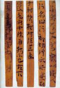 一九八六年,甘肃文物考古研究所在天水市北道区放马滩古墓群中的一号墓中发现竹简四八○余枚。竹简浸泡在棺液中朽腐严重,已发黑色,简文字体漫漶。竹简有二种形制,甲种长二十七点五厘米,宽○点七厘米;乙种长二十三厘米,宽○点六厘米。