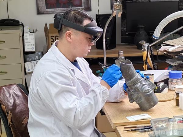 “基于拍摄、处理、显示、交互等硬件模块的相互配合,AR眼镜可实现虚实融合、空间定位、虚实交互等功能。”张珮琛介绍,戴上AR眼镜后,青铜鼎实物便进入AR眼镜可视范围内,计算机渲染的虚拟鼎即在内层镜片中被激活播放,并与实物青铜鼎锁定。此时,虚拟鼎与实物鼎高度吻合,视觉错觉使得鼎腹内叠压、悬浮的青铜碎片和残足变得清晰可见,使提取碎片工作变得相对轻松和安全。“修复师还可以通过手势与眨眼指令调动拍照、视频录制模块,记录眼镜中的一切细节,作为文物修复档案保存与研究,甚至可以通过网络多人联机,实现远程文物病害会诊、方案制定与修复研讨。”