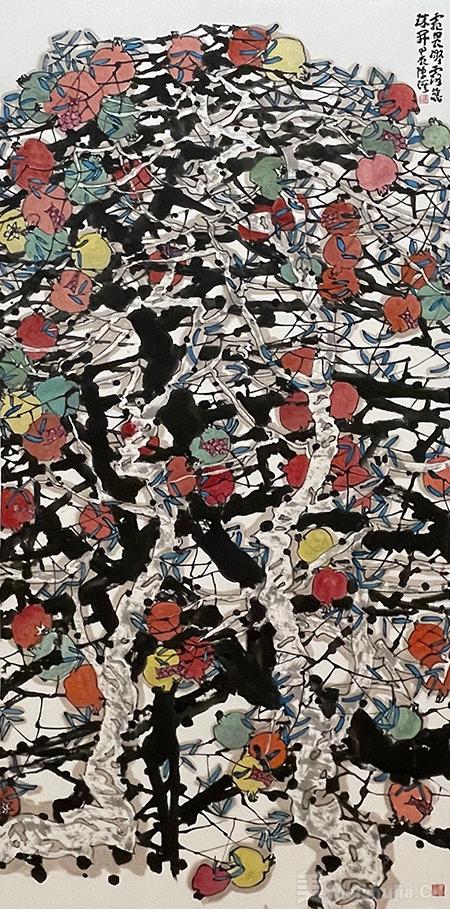 这件作品标志着我艺术语言的又一次蜕变:造型趋于抽象,色彩更加自由,空间更具现代感。但细细品味,那些看似随意的挥洒,实则延续着“三矾九染”的敷色传承;狂放的笔势中,依然可见徐渭大写意的精神血脉;而石榴爆裂的生命力,何尝不是对“气势”这一美学追求的终极诠释?