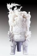 实验性作品也同样惊艳,苏献忠的《纸》以极致的轻薄柔软,重塑白瓷的坚硬形态,从层层叠叠、薄如蝉翼的“纸”中,流淌出反差感与诗意;另一件《等花开》由一朵朵小花组成,花树错落、色彩斑斓,将传统捏塑工艺发挥到极致。彭成雄的《汉字艺术·百家姓》将“中国汉字+标点符号元素”与传统陶瓷工艺巧妙结合,数百个姓氏的陶瓷雕塑用一个架子垒起来,吸引观众一边抬头找自己的姓氏,一边饶有兴味地品评字形。