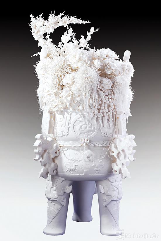 连德理说:“这件迄今最薄的德化白瓷作品,从制胎到烧成花了六七年,历经上百次失败。创作时得不断调整瓷土配比、控制窑温,既需要精益求精的技艺,有时也带点运气。《神话》在灯光下白中透红,透着独特的温度,希望观众能感受到这份灵动。”
