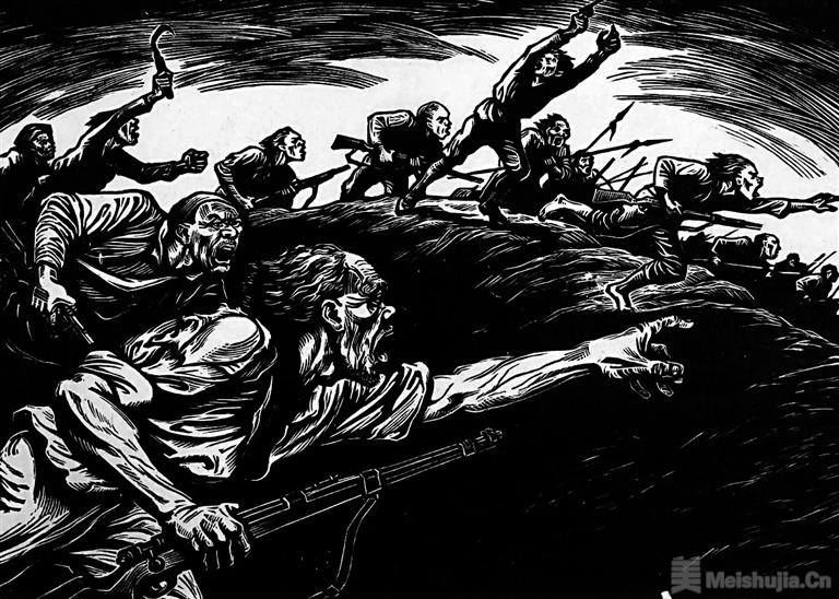 20世纪30年代以来,左翼木刻家便通过手中的刀与笔,刻画出彼时救亡图存的民族意志和爱国主义的时代精神。李桦的《怒潮组画》以喷薄汹涌的动势和现实主义美术的力量展现人民抗争所带来的摧枯拉朽的时代能动性;李少言的《地雷战组画》以平直的刀笔语言真实展现抗战胜利前夕全民性的战争智慧;牛文的《晋绥抗战风云录》和《人民画报》木刻连环画以中国传统的线条美学描绘了边区根据地抗敌、生产、建设的生活日常;王树艺的《狱中纪实》组画以自身被捕入狱的亲身经历创作而成,揭露了旧社会的黑暗统治与进步人士的恶劣处境……