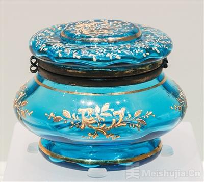 清代蓝玻璃描金花盖罐造型考究,纹饰精美,是清宫后妃生活用品,藏于沈阳故宫博物院。盖顶部隆起,在宝蓝色玻璃地上描金缠枝花卉纹,盖罐上下口缘均镶鎏金铜饰。罐腹部上下各饰描金弦纹,中间饰描金花卉纹,盘形托边缘亦描金一周。