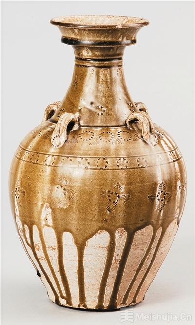 寿州窑是隋唐时期制瓷名窑,窑址分布在今淮南、凤阳、蚌埠等地。馆藏一级文物寿州窑青釉印花四系盘口瓷壶,口径12厘米,底径11.8厘米,高35厘米。盘口,长颈,鼓腹下敛,平底。肩部有4个桥形竖纽,壶身有4层模印草叶纹。通体施青釉至下腹部,釉色透明,并有细小开片,腹下流釉20多处,浑然天成,十分美观。此壶制作考究,堪称隋代寿州窑产品的巅峰之作。