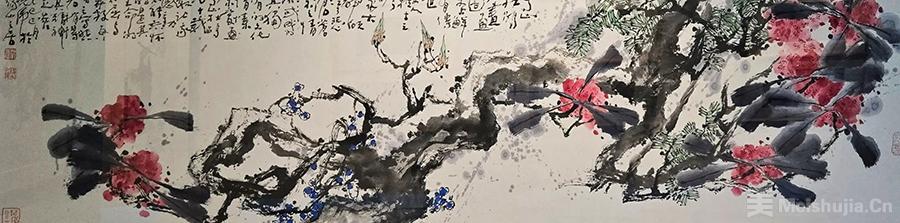 构图层面,他打破传统花鸟画程式化布局局限,融入现代构成意识,让画面兼具传统气韵与当代视觉张力。长卷《高山杜鹃图卷》以枝干为脉络如游龙贯穿,疏密错落有致,留白处气脉流通,暗藏现代空间分割巧思;竖幅《云闲月静时》梅枝盘曲交错、主次分明,以“一波三折”韵律支撑画面结构,形成强烈视觉焦点。同时,他注重“书画印”有机统一,狂草题跋与画面气韵呼应,朱红印章点缀其间,既强化文化厚重感,又平衡画面色彩,让书之韵、画之境、印之趣交融,实现“似古实新”的形式突破。
