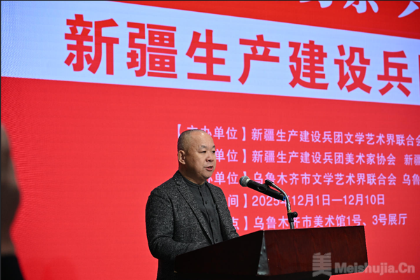 兵团美术家协会主席万里明介绍了展览的组织与评审情况。他表示,此次展览不仅是兵地美术创作成果的集中展示,更是推动兵地艺术交流、激发创作活力的重要平台,希望兵团广大美术工作者继续扎根生活、扎根人民,创作出更多有筋骨、有道德、有温度的精品力作。