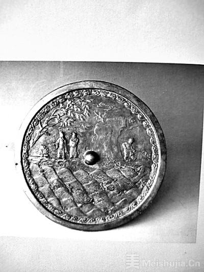 1975年黑龙江省绥棱县出土一枚金代铜镜,《黑龙江古代文物》最初定名为“人物故事双鱼镜”,介绍称“镜背主体图案分上下两部分,下半部为线条流畅的波纹及在其中相对穿行的双鱼。上半部的右边是一座突兀的太湖石假山……往右,是一个着短袍、戴尖顶草帽的人正在田间用锄头给禾苗锄草;上半部的左边是两个着长袍、戴幞头的人站在梧桐树下。右边的人袖手,左边有长髯的人手指一株盆景植物,似乎正对右边的人在讲什么……整个图案构思新颖,表现了当时的‘劳心者治人,劳力者治于人’的阶级关系。”丹薇《绥棱县出土的一件金代铜镜》则做了新的解读:“在一棵枝叶繁茂的大树下,一对古人相会在花草如茵、湖石矗立的庭园中。主人伸手相邀礼让,友人拱起双手致谢。石山右边有一仆人持锄劳动。顶部的天空中飘着云彩,似有微风吹拂着花草树叶。画面描绘出封建社会士大夫闲适安逸的园林生活。”王禹浪等《金代铜镜初步研究》又提出不同看法,认为镜中人物是“典型的女真人形象”,“整个镜背图案所表现出的气氛,似乎是老者在告诫那位年轻的官吏:祖先创业之不易,勿忘稼穑之艰难。这种思想与金世宗那种‘太平岁久,国无征徭,汝等皆奢纵,往往贫乏,朕甚怜之。当务俭约,无忘祖先艰难’的治世思想相合,并非简单的‘描绘出封建社会士大夫闲适安逸的园林生活’。”关燕妮《略论金代人物镜》则重新命名为“春耕镜”,认为“这一图案极有可能表现的是金朝官员参加春耕时的场景。据史书记载,金朝十分重视农业生产,每年的正月元日,皇帝都会与群臣到田间耕作,象征新的一年从农事开始。”数十年来,众说纷纭,莫衷一是。