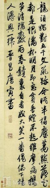 ● 文徵明《行草七绝》,纸本,纵109.6厘米,横30.6厘米。其文曰: