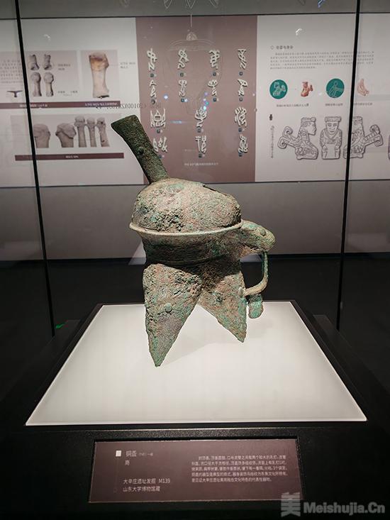 在商王朝东扩的进程中,中原的商文化与山东本土的东夷文化碰撞交融。展厅中,一件封顶设计、顶盖圆鼓的铜盉引人注目。这件酒器另有斜直流管和扁带状鋬,下方3个袋足,铸造工艺十分精美。它的独特之处还在于,既有体现商文化的兽面纹及特色器型,又有东夷文化特有的鸟绘纹装饰,被认为是商朝贵族吸纳东夷审美后的产物,见证了两种文化的“美美与共”。