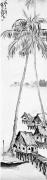 陈宗瑞于1910年出生于广东澄海,1934年定居新加坡,在南洋美专中国画系任教四十余年,是最早探索以传统山水画程式表现南洋风土的画家之一。他常于户外写生,喜欢捕捉各种风景,渔码头、乡村以及不同民族的人物肖像都是他入画的题材,在其1937年所作的《甘榜景色》中可见到椰树、亚答屋、栈桥等极具南洋风情的景物。不同于传统山水画中的四君子、崇山峻岭、亭台楼阁等图式,南洋的椰树、亚答屋在传统画谱中是缺席的,画家为此也进行了笔墨技法上的重构。如《甘榜景色》中占据画面主导的两株椰树,没有采用传统画松柏的苍劲盘曲,而以渴笔表现椰树树干粗糙且带有节律的环状纹理,这种修长的垂直线条打破了传统山水画常追求的“S”形构图,其直立冲天的样态更符合热带植被的生长特性。在椰树叶片的塑造方面,传统的竹叶画法在这里被改造,转以放射状的粗笔捕捉椰树叶在海风吹拂下的动势与纷乱感。虽然处理方式相较于后期作品略显生涩,但可以看出画家用书写线条概括热带植物的初步尝试。