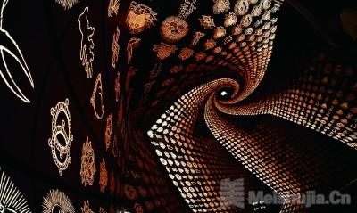 另一方面,新媒体艺术和沉浸式展览,则在积极探索藻井与观众之间的全新相遇方式。通过实时渲染与投影映射技术,原本静止的藻井纹样可以被赋予生命:云纹缓缓流动,莲瓣随呼吸舒卷,如星轨般的几何线条在穹顶上旋转、聚集、消散,营造出介于真实与虚拟之间的“光影藻井”。观众不再只是仰望者,而成为光影场域中的参与者——步伐、目光甚至心率,都可以被传感器捕捉并反馈为画面的变化,使“穹宇”对每一个个体作出独一无二的回应。