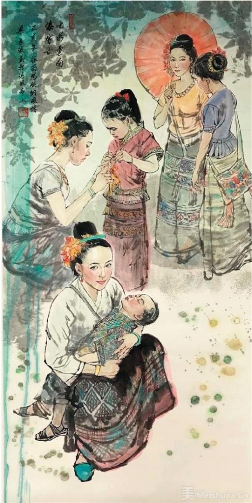 谷雨那天,画家梁平波通过微信发来了他的国画新作《七彩云南傣家女》,这是他刚刚结束西双版纳之行后回顾整理的第一幅作品。
