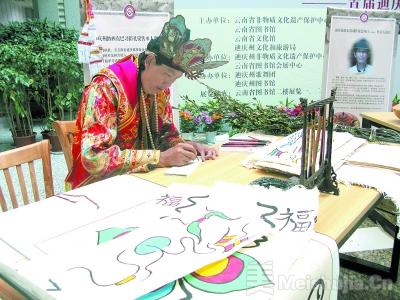 迪庆州纳西东巴习俗礼仪传承人和树昆现场书写东巴文 杨国勤 摄