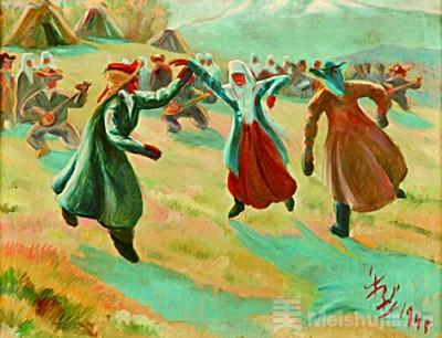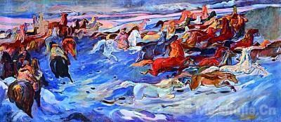 自五四运动起,陈独秀、康有为等人便推崇写生之法,主张借鉴西方绘画的写实方法发展中国画创作。时至二十世纪三四十年代,由于多种因素,一批艺术家远赴西北写生,在异域风情的滋养下,他们的艺术个性得以发挥,艺术技巧得以升华,创作出许多精品力作。作为展览的开篇,司徒乔的油画《套马》便是其中的典型代表。1943年,随“西北视察组”来到新疆的司徒乔,被这里雄浑壮阔的奇景所触动,历时两年创作了280余幅作品。“当黄昏弥漫四郊,雪野正映着紫霞时,一群群赤黑枣青的大小英俊,正被人们用长绳圈套。那狂奔疾袭、翻冰溅雪的场面,恐怕就是最麻木的灵魂,看了也会兴奋的吧!我决定画一幅圈马图,状诸英俊奔腾扎挣之姿。”司徒乔在《新疆猎画记》中写下了自己的所见所感,同时也将这份身临其境的震撼化为《套马》里充满激情的笔触与热烈奔放的色彩。