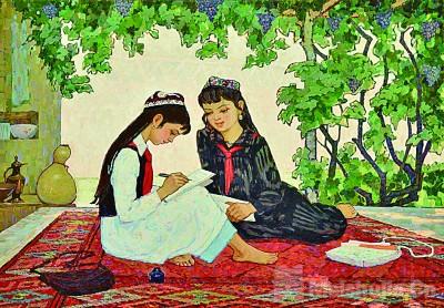 1942年,毛泽东同志发表了《在延安文艺座谈会上的讲话》,鲜明指出文艺要为最广大的人民大众服务,鼓励艺术家到人民大众的生活中去开掘创作源泉。新中国成立后,新一代艺术青年搭上西行的列车,以新疆的社会主义建设和人文风情为表现重点,写生队伍空前壮大。由此,描绘新疆不再仅仅是个人行为,而成为美术创作群体的共同课题,“写生”也从一种技术方法,转变为一种行为方式。展厅内,罗工柳的《新疆老人》、梁玉龙的《阳光》、阿曼·穆罕诺夫的《葡萄架下》皆为人物题材油画。其中,《葡萄架下》描绘了两名席地而坐的女孩正专心致志学习的生动瞬间,天真质朴的脸庞、特征鲜明的民族服饰、鲜艳的红领巾,加之钢笔、墨水瓶、书包等细节刻画,共同构建起极富时代感的温馨画面,引得许多观众驻足。