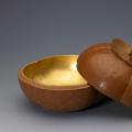 文竹金漆里柿子式盒以黄杨木制成,其木质柔韧细密、色泽淡黄无疵。整器雕刻成柿子的形状,通体镶嵌竹黄。柿盒从中部可以一分为二,盖子和盒身通过子母口扣合,内壁涂有金漆。盖钮部分雕刻成柿蒂状,色泽和质地与竹黄相得益彰。柿蒂逼真,观之喜人。清朝中期颇为流行的文竹仿生器具是实用性与观赏性兼具的陈设品,一般被放置在几案与格架之上,以装点生活。这件柿形盒既展现了文竹仿生器具匠人的巧思与技艺,更体现了当时生活的精致与品位。